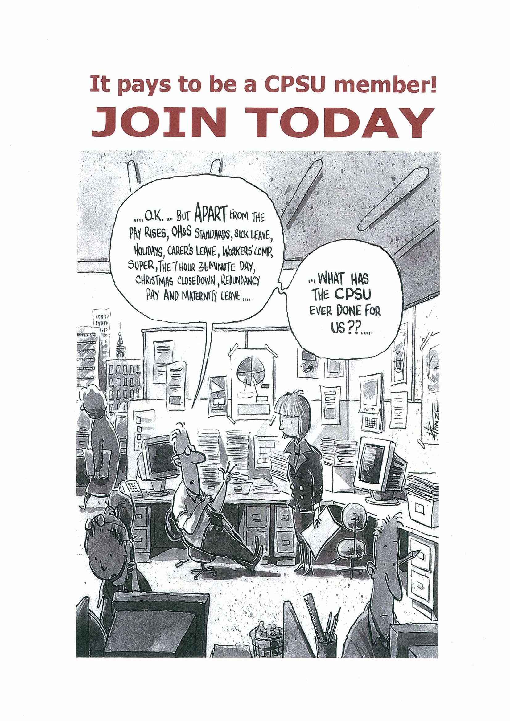 CPSU members won this new 1.5% pay rise straight off the back of 1.75% that was recently paid and backdated to 1st January and these combined equate to hundreds of extra dollars and should put a spike in your take home pay each fortnight. Approach one of your colleagues who is not yet a CPSU member to ask them whether they’d like to contribute as well as receive. Ask them to use some of the extra pay and join. Receiving is great but contributing delivers greater benefits for ALL.